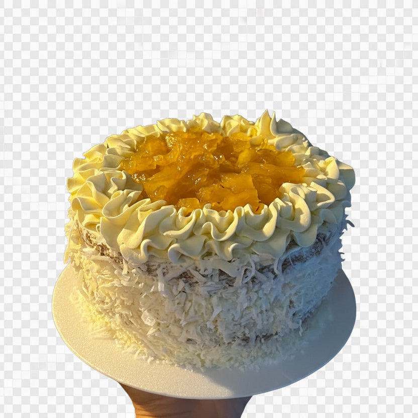 Torta blanca con trozos de piña y coco, rellena y decorada con suave crema de coco.